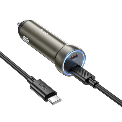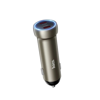 Auto punjač sa dva priključla Tipa C. Dolazi u kompletu sa kablom Tip C na Tip C.