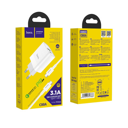 C80A Rapido PD + KC3.0 zidni punjač, USB / Type-C izlaz, EU utikač, set sa Type-C na Type C kabal.