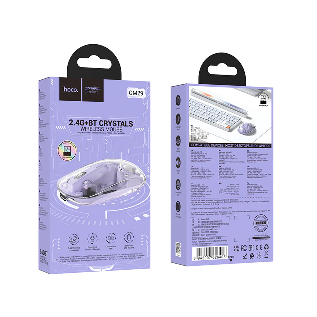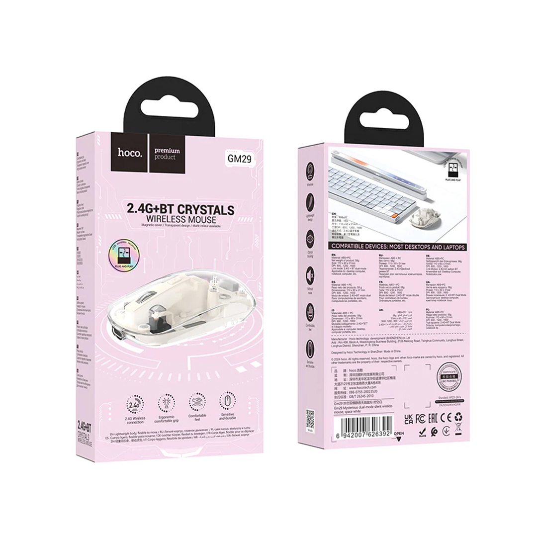 HOCO GM29 2.4G Kristal Dual-Mode tihi bežični miš DPI 1600 3D ergonomski optički USB za igre za laptop tablet Windows PC