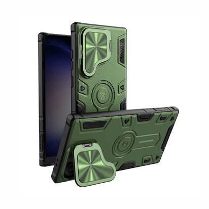 Metalna alkica presvučena legurom cinka smeštena je u poseban otvor na poleđini maske i može da se izvuče i posluži kao postolje telefona.